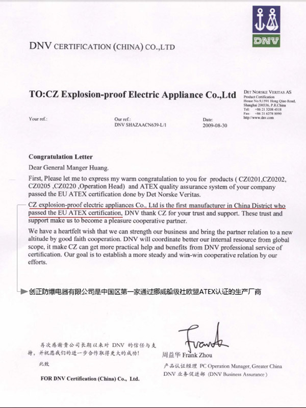 中國大陸第一家通過挪威船級社(DNV)ATEX防爆產品認證的企業