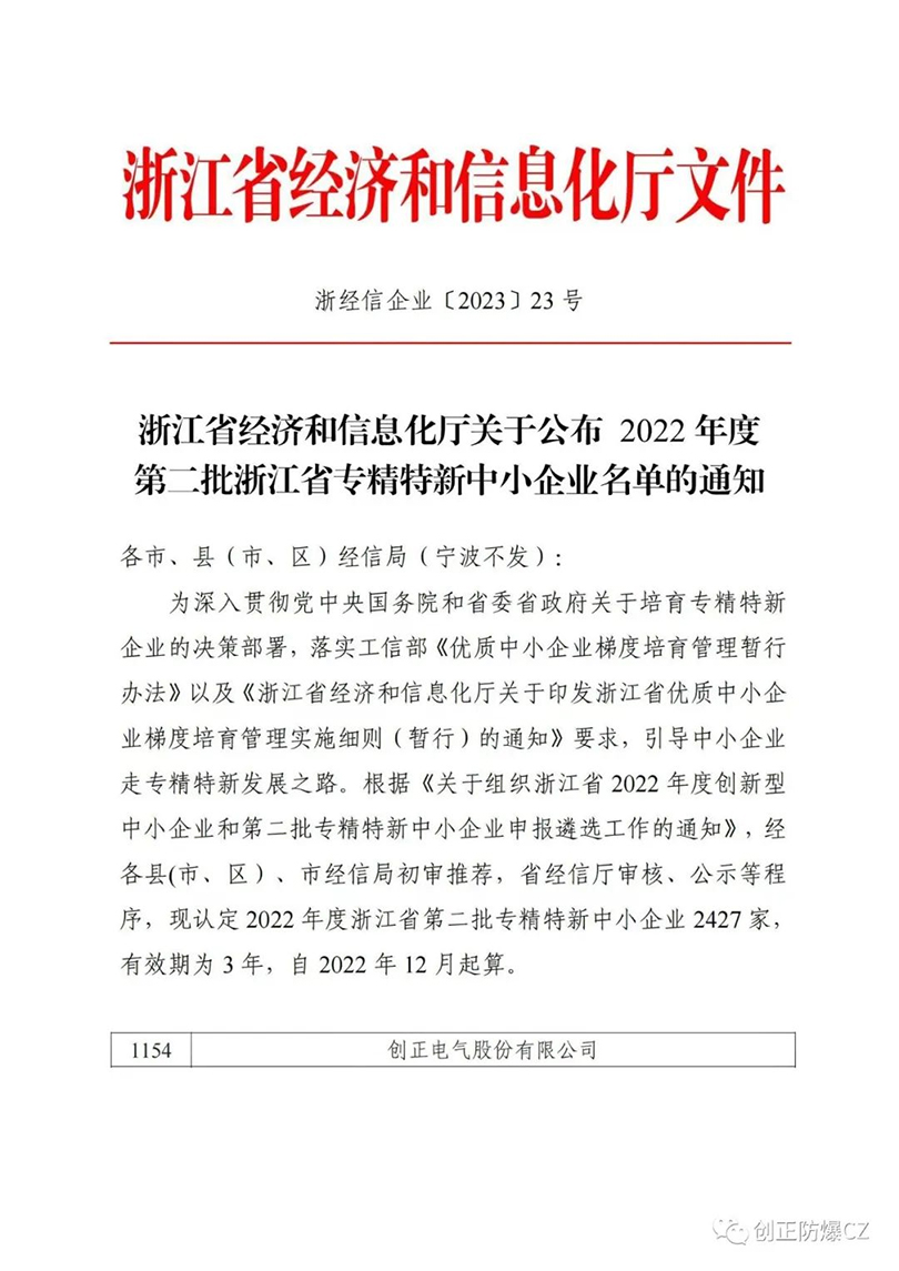 據浙江省經濟和信息化廳發布浙經信企業【2023】23號文件,創正電氣股份有限公司榮獲2022年浙江省專精特新企業榮譽稱號。