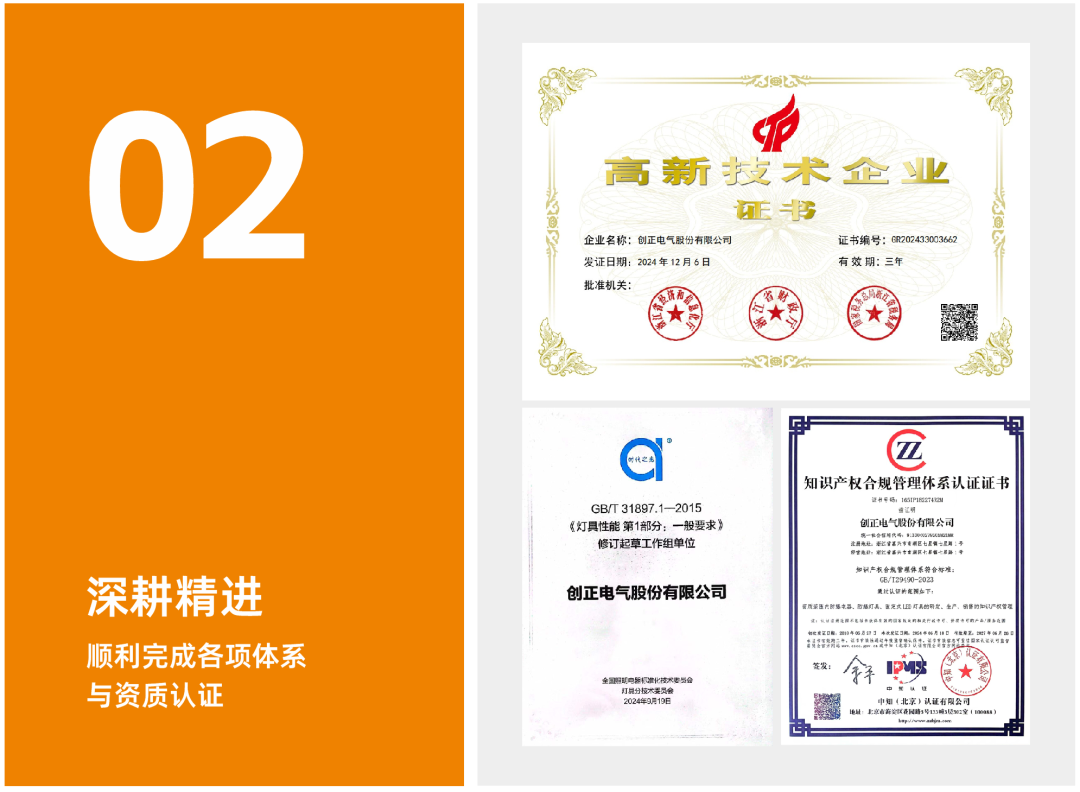 2024年公司順利完成年度各項體系復審工作,一次性通過DNV、 ISO9001、ISO4001、ISO45001、IECEx體系等年度復審工作,并榮獲了全國照明電器標準化委員會燈具分技術委員會頒發的《燈具性能第一部分:一般要求》修訂起草工作組單位資質證書。?????